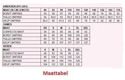 | Kindermaat | 104/116, 128/140, 152/164 |